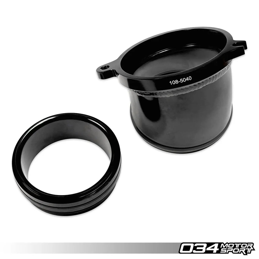 El tubo de admisión del turbo 034Motorsport está mecanizado en aluminio 6061-T6 de alta calidad con un diámetro interno de 76 mm, lo que garantiza un flujo de aire mejorado y uniforme hacia el compresor. La brida del compresor, mecanizada por CNC, está diseñada con precisión para ajustarse perfectamente a la carcasa del compresor, lo que permite un flujo de aire eficiente y sin obstrucciones.