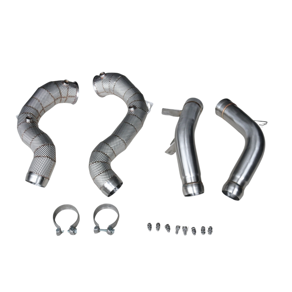 De downpipe bestaat uit vier delen, sluit direct aan op de originele uitlaat en garandeert pasgarantie zonder aanpassingen. Handgemaakt van RVS304 met TIG-gelaste constructie, voor maximale stevigheid en duurzaamheid.