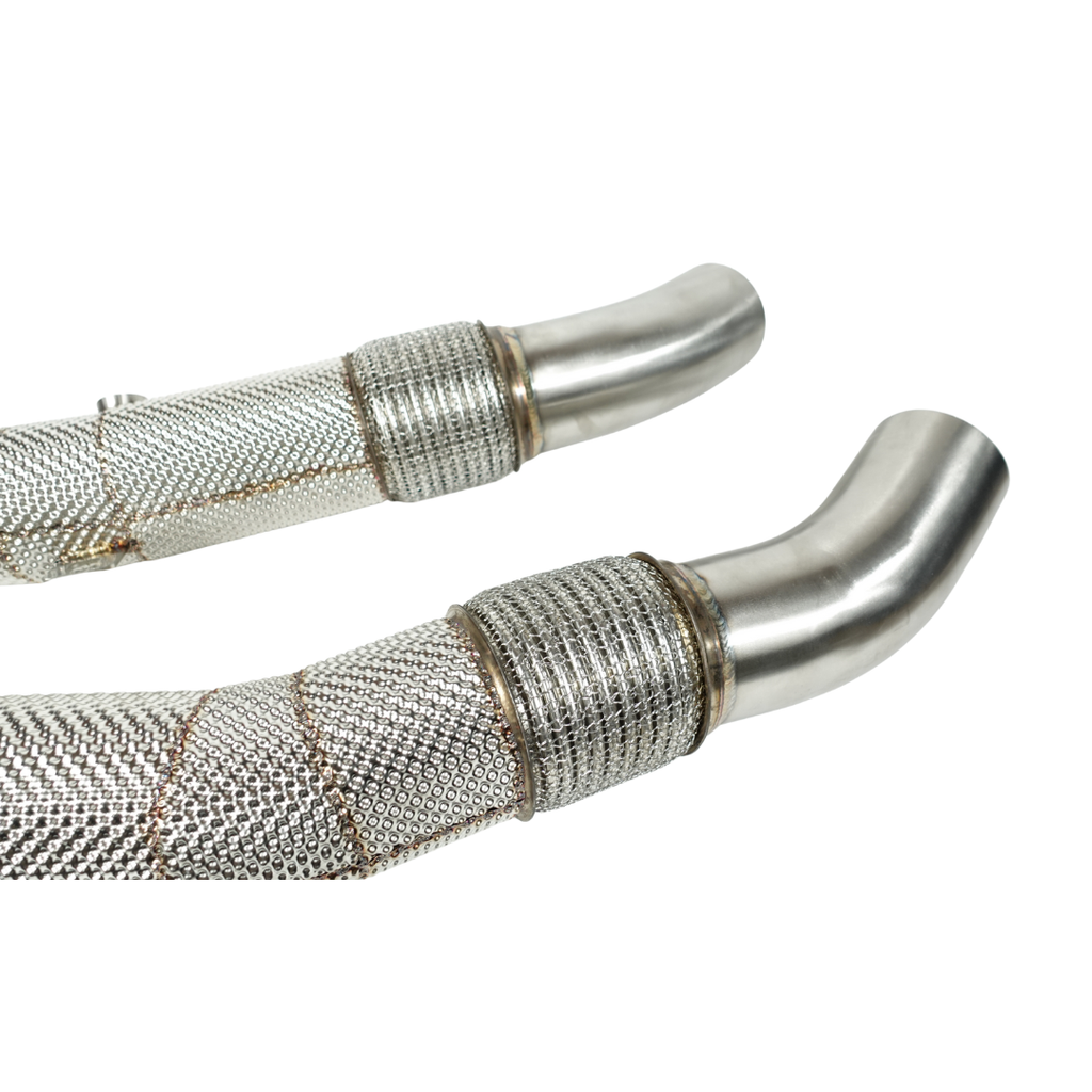 - Downpipes met geïntegreerd hitteschild (links + rechts)